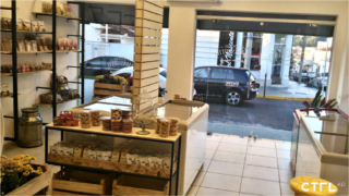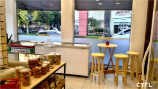 Na fachada, os toldos trazem um ar convidativo à quem circula pela rua e estão identificados com as cores da marca da loja. Na decoração interna, elementos como o crochê do assento dos bancos, os caixotes de feira e flores da estação, deixam a loja mais aconchegante e tornam o ambiente mais familiar e acolhedor.